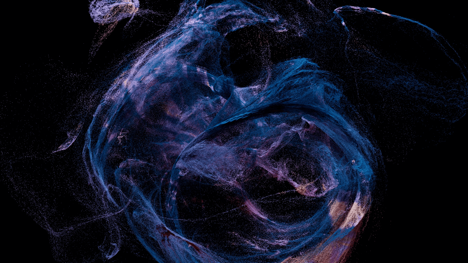 A dynamic particle simulation exploring fluid motion and organic forms, inspired by